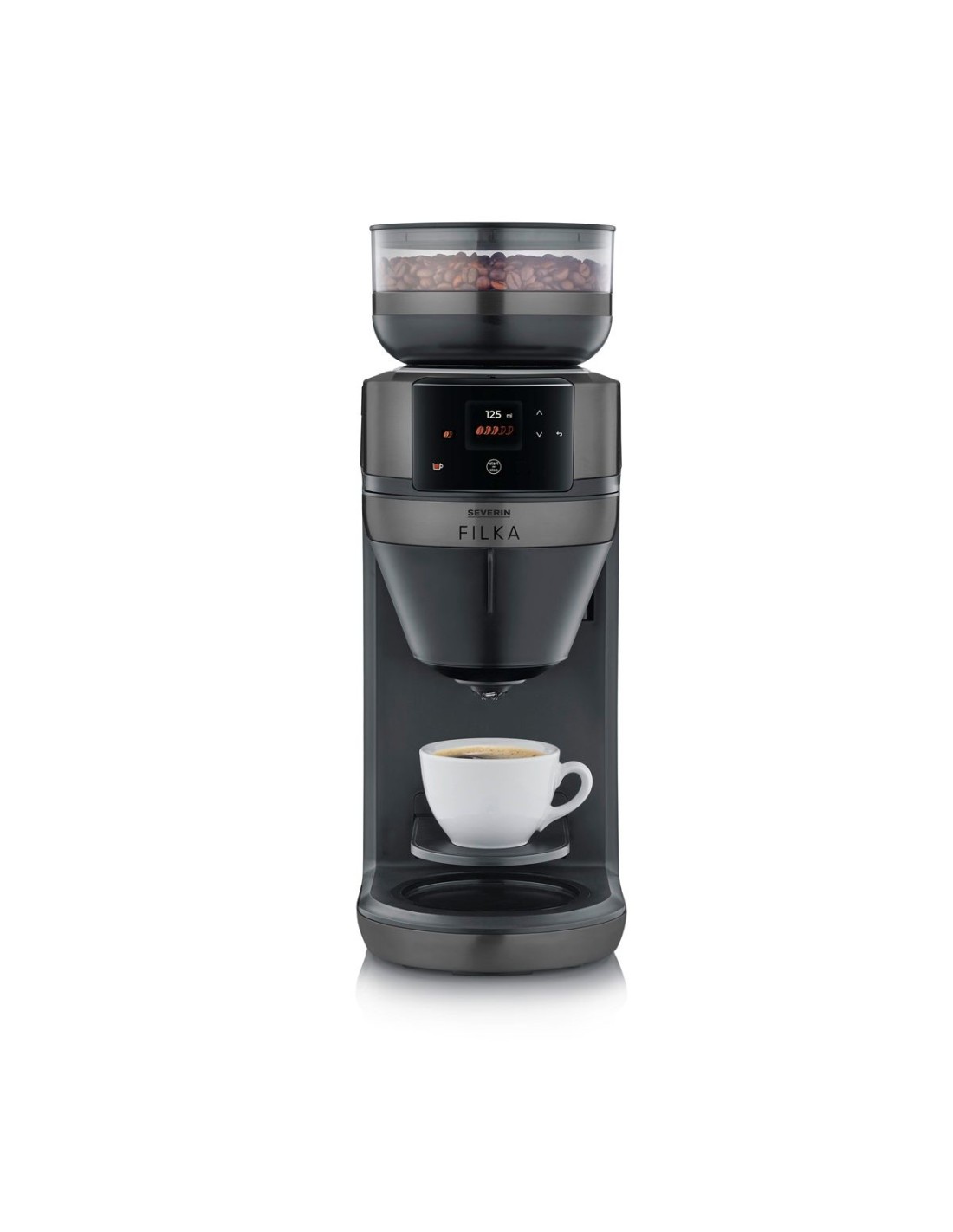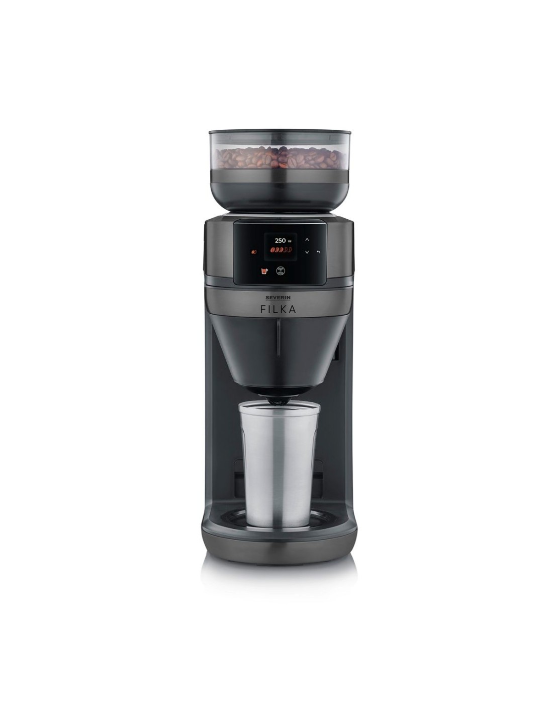 La cafetera FILKA de Serverin destaca por su tecnología FILKA 5-en-1, una base ajustable que se adapta a una amplia variedad de recipientes, desde una jarra hasta una taza pequeña o tazas térmicas. La cantidad de café se puede ajustar individualmente de 100 ml a 350 ml en incrementos de 25 ml.