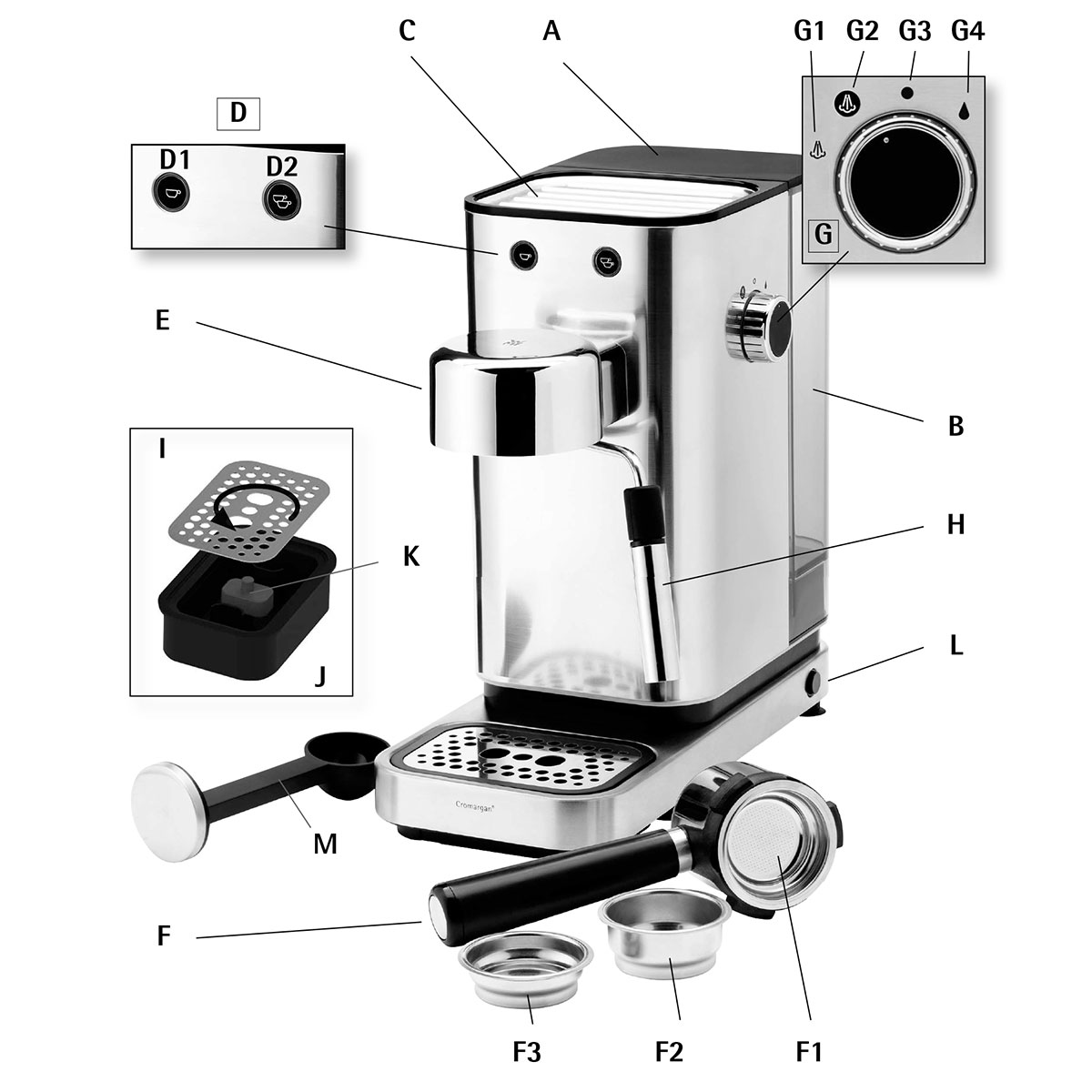 Diariamente, se debe vaciar y limpiar la bandeja recogegotas (J) (antes de que el flotador rojo lo indique) y el depósito de agua, el cual debe rellenarse siempre con agua fresca. Deberás limpiar la boquilla de vapor (H) inmediata después de usarla con leche (dejando salir agua caliente por 5 segundos) y una limpieza física con agua tibia para evitar obstrucciones.
