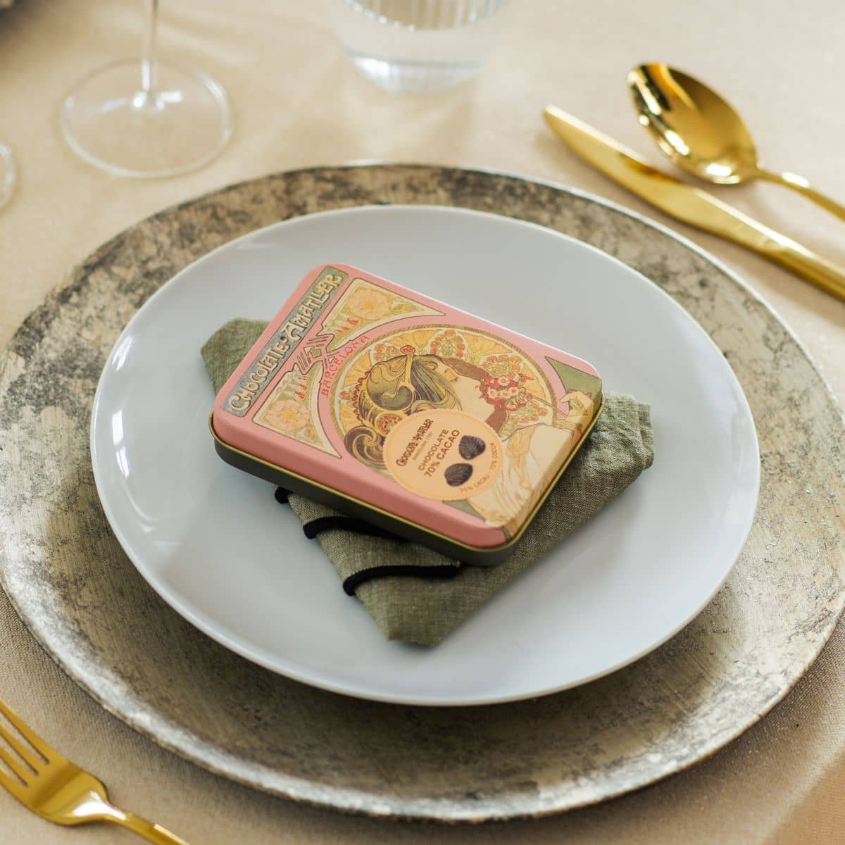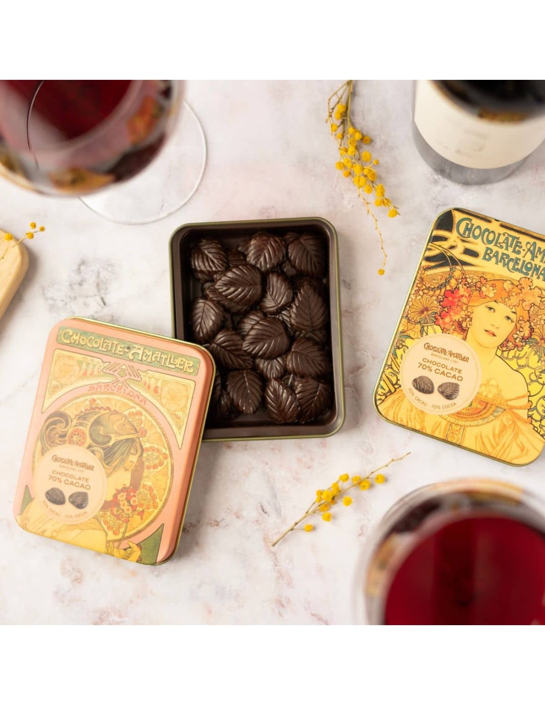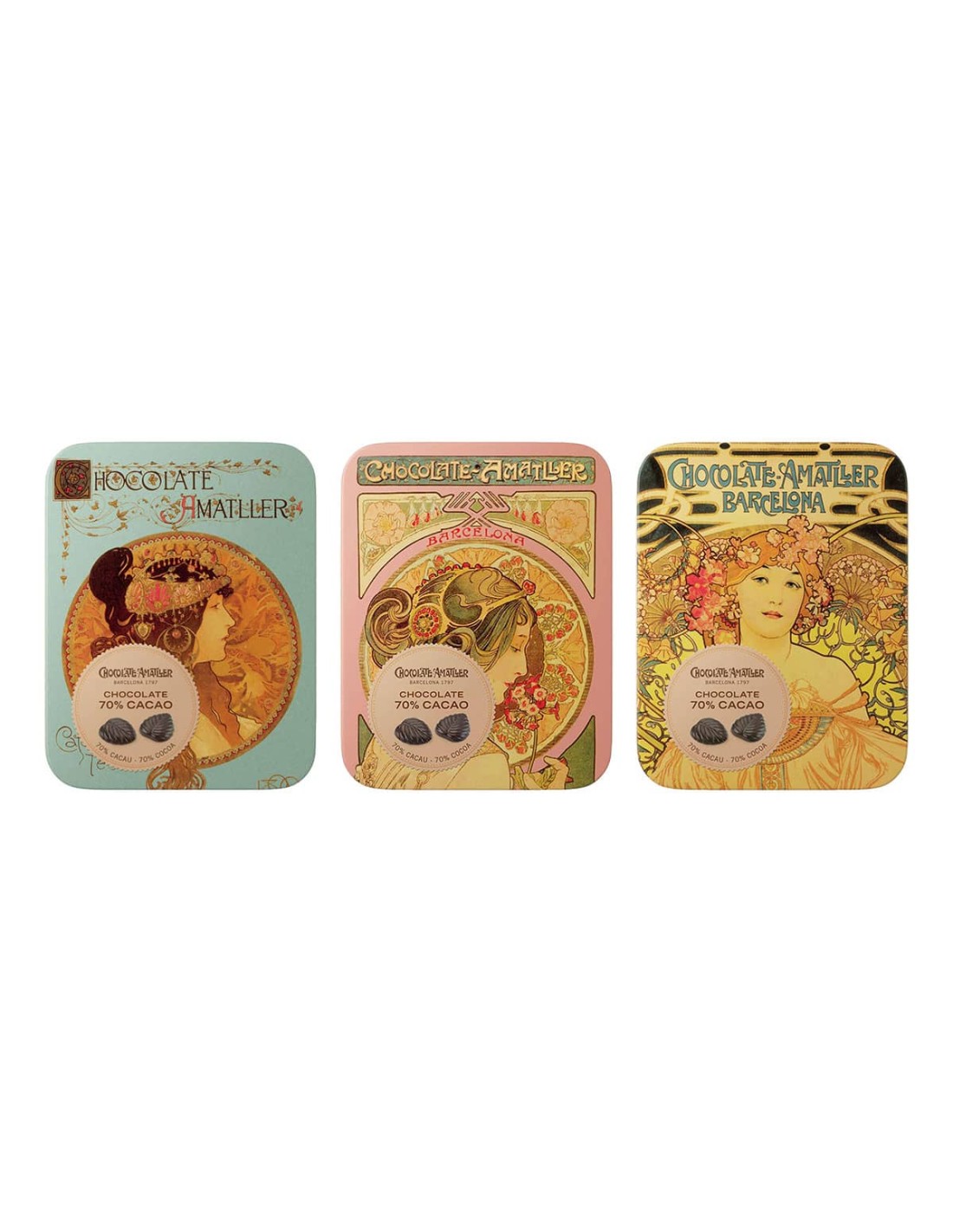 Se presentan en una bonita caja de metal decorada con los carteles antiguos de Chocolate Amatller. Es el regalo ideal para amantes del chocolate.